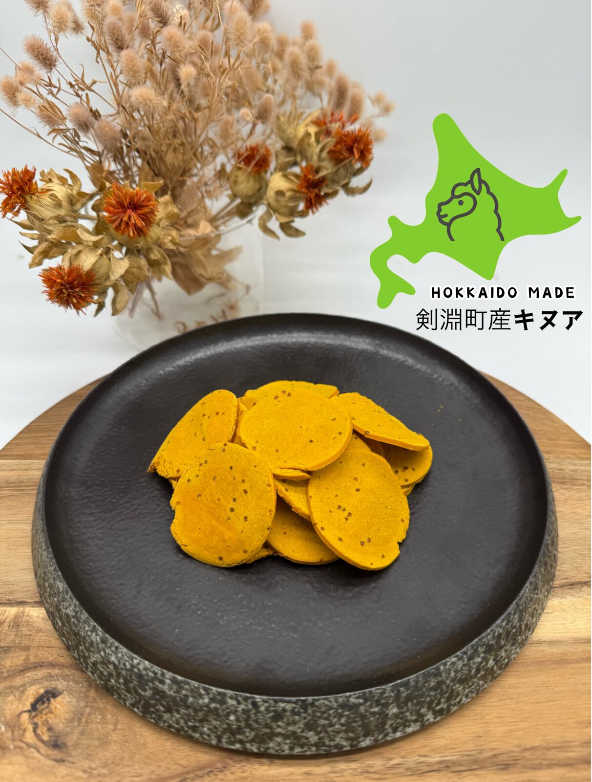 北海道剣淵町の自然豊かな大地で育ったキヌアに、北海道産かぼちゃと米粉を合わせた、しっかり硬めのヘルシークッキー。